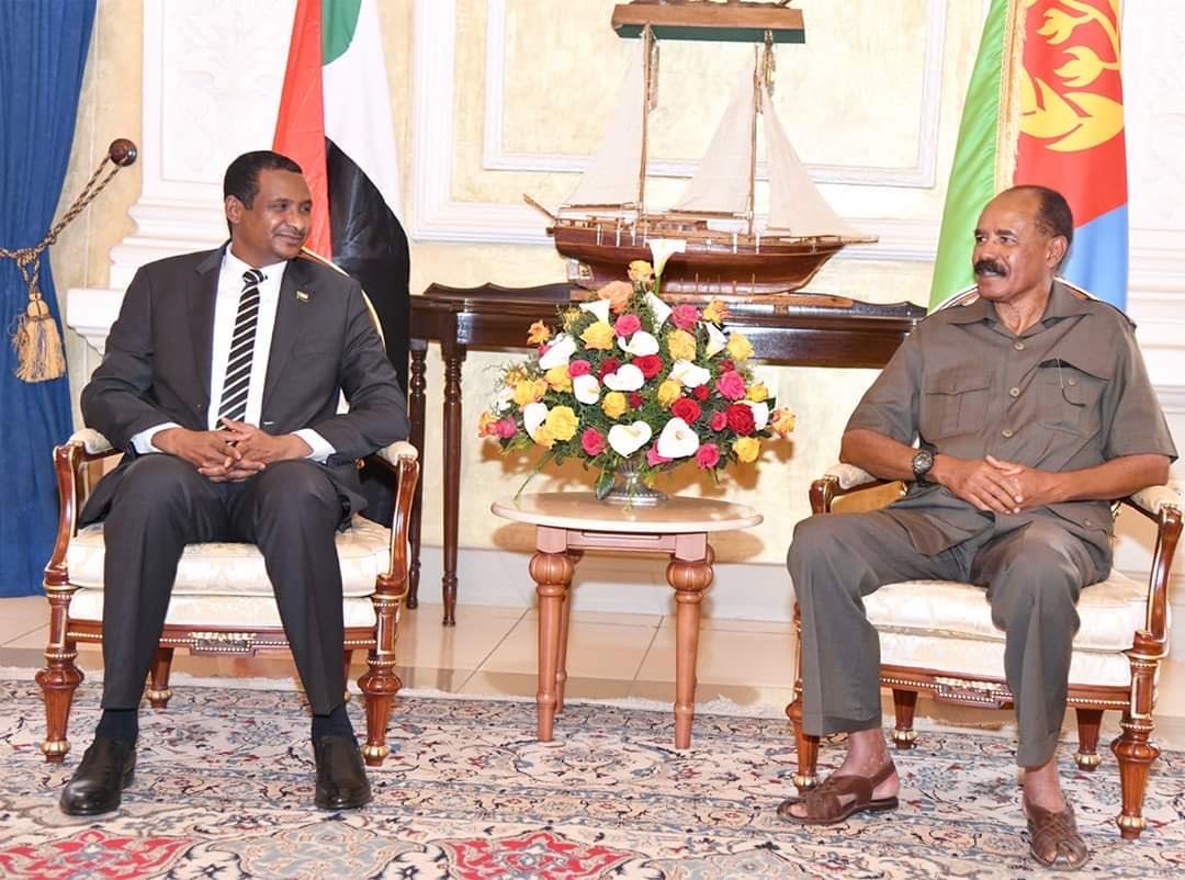 عددٌ من وسائل الإعلام والتواصل الاجتماعي، تناولوا الزيارة المُفاجئة للمُرتزق حِمِيْدْتِي إلى إريتريا، وذَكَرَت صحيفة الانتباهة في 2 نوفمبر 2019، أنَّ الزيارة لحسم (قضايا مُهِمَّة) بملف السلام بالسُّودان، وتهدئة الشرق السُّوداني الذي انفجر مرتين في نزاعٍ قَبَلِيٍ (محدود)، وقابلٍ للتطوُّر ودخول الأوضاع لمراحلٍ (حَرِجَة)، مما حَتَّمَ (مُشَاوَرَة) أفورقي حول (استقرار) الشرق، ودعم/حماية (التفاوُض) الجاري بجوبا. مُشيرةً لدعوات المُرتزق حِمِيْدْتِي المُتعلِّقة بتحقيق السلام بكل السُّودان، واهتمامه بشرق السُّودان خصوصاً، لارتباطه بـ(أمن) البحر الأحمر، حسب تعبير الصحيفة!