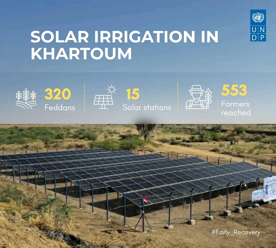 أطلق برنامج الأمم المتحدة الإنمائي مبادرة لإعادة إعمار القطاع الزراعي في ولاية الخرطوم، عبر تركيب 15 محطة ري تعمل بالطاقة الشمسية لتغطية مساحات زراعية واسعة تقدر بنحو 320 فداناً.