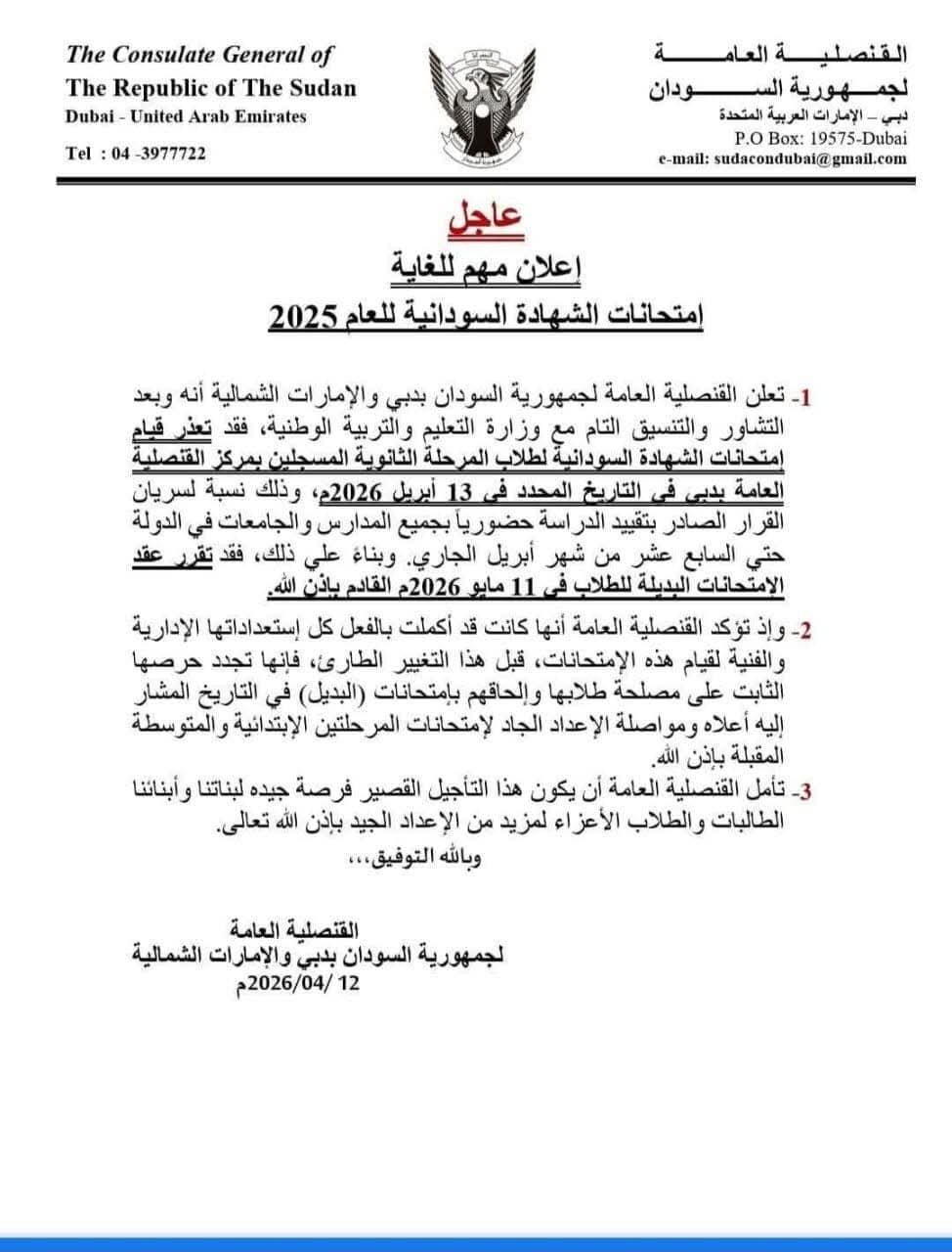أعلنت القنصلية العامة لجمهورية السودان بدبي والإمارات الشمالية عن تعذر قيام امتحانات الشهادة الثانوية بمركز القنصلية في موعدها المقرر سابقاً (13 أبريل 2026)، وتقرر عقد الامتحانات البديلة للطلاب في 11 مايو 2026.