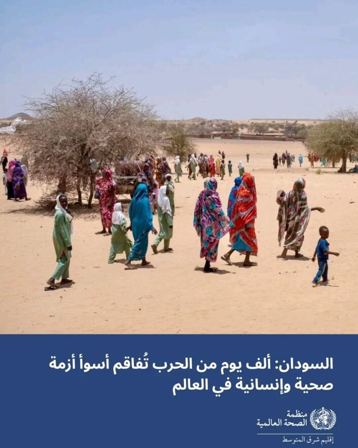 قالت منظمة الصحة العالمية إن الحرب في السودان دخل يومه الألف، في ظل أوضاع إنسانية وصحية بالغة التعقيد، حيث يحتاج أكثر من 20 مليون شخص إلى مساعدات صحية عاجلة.