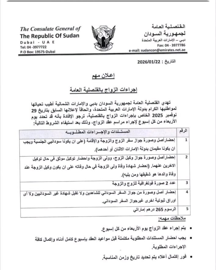 أعلنت القنصلية العامة لجمهورية السودان بدبي والإمارات الشمالية عن بدء تطبيق ترتيبات جديدة لإجراءات الزواج بالقنصلية، على أن تُجرى مراسم عقد الزواج يوم الأربعاء من كل أسبوع، وذلك بعد استيفاء الشروط والمستندات المطلوبة.