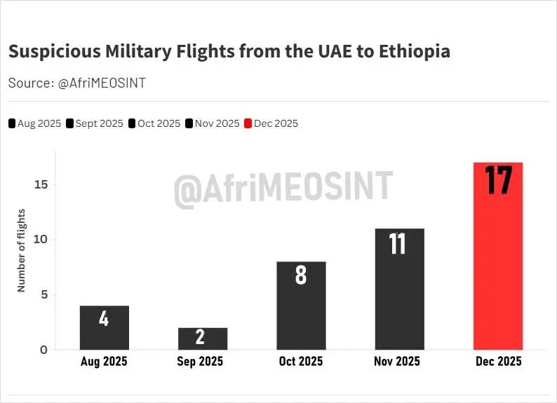 ووفقاً للتقرير، رصد المركز 42 رحلة شحن عسكرية انطلقت من دولة الإمارات العربية المتحدة باتجاه إثيوبيا خلال الأشهر الخمسة الماضية.