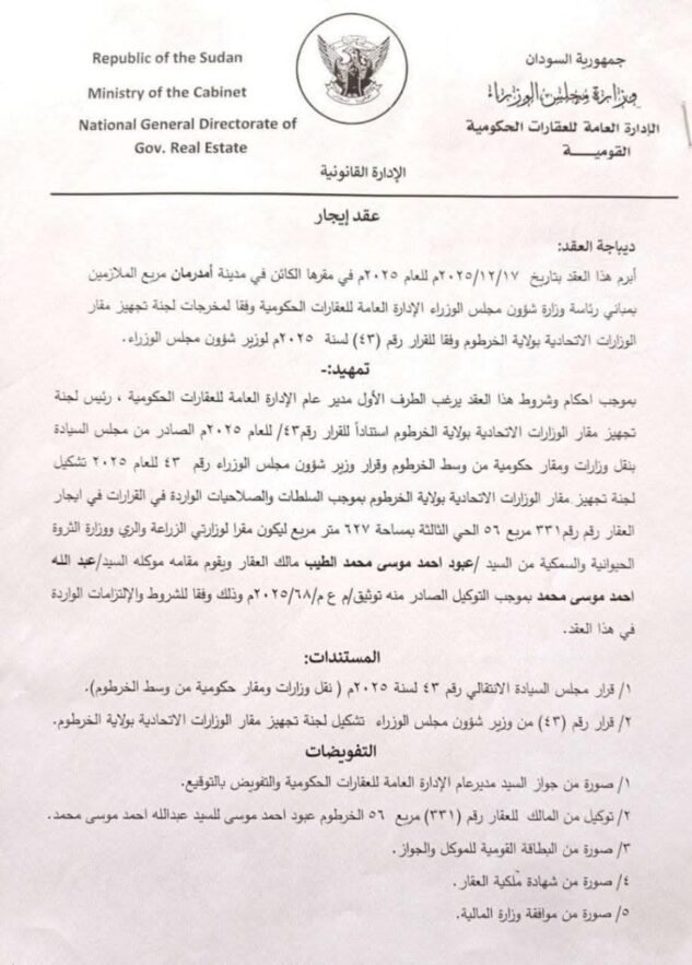وأوضح أن الحكومة استأجرت أربع وزارات من أصل 22 وزارة، حيث وقعت عقدين بينما يخضع عقدان آخران للإجراءات القانونية. وتشمل الوزارات: الزراعة والري في أركويت مربع 53، والثروة الحيوانية في أركويت مربع 53، والخارجية والتعاون الدولي في الرياض مربع 21، والنقل والبنية التحتية في أم درمان – كرري / شارع الوادي خلف أبو الفاضل.