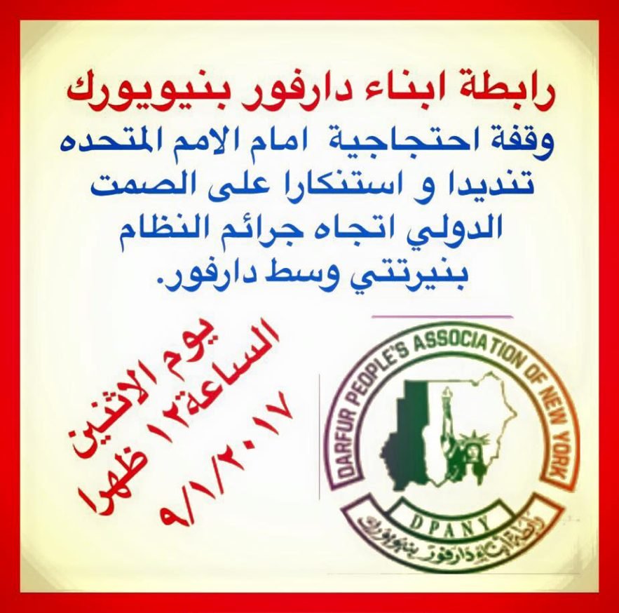 تنظم رابطة أبناء دارفور بنيويورك و مجموعة SudanRevolts بنيويورك الكبرى وقفة إحتجاجية أمام الأمم المتحدة بنيويورك، تنديدا بمجزرتي نرتتي و الجنينة التي إرتكبتهما مليشيات البشير هذا الاسبوع و إستنكارا على الصمت الأممي تجاه جرائم البشير ضد المواطنين العزل في السودان عموما و في دارفور و جبال. النوبة و النيل الأزرق خصوصا و المطالبة بإدانة صريحة من مجلس الأمن الدولي و إتخاذ كل التدابير اللازمة لحماية الأبرياء في مناطق الحروب من آلة القتل البشيرية.