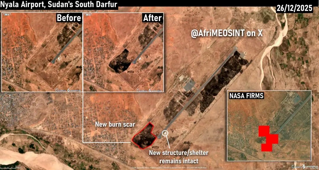 كشفت صور حديثة التقطتها الأقمار الصناعية، بتاريخ 23 ديسمبر الجاري، عن تعرض مطار نيالا الدولي بولاية جنوب دارفور لضربة جوية يُرجح أن القوات المسلحة السودانية قد نفذتها، في إطار عملياتها الرامية لتعطيل خطوط الإمداد في المناطق التي تسيطر عليها قوات الدعم السريع.