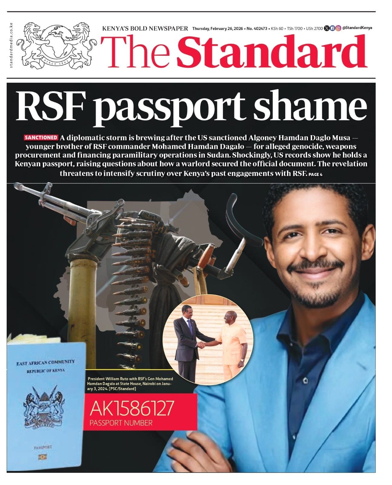 أثارت صحيفة “ذا ستاندرد” الكينية جدلاً واسعاً بعد كشفها أن القوني حمدان دقلو موسى، الشقيق الأصغر لقائد قوات الدعم السريع محمد حمدان دقلو، يحمل جواز سفر كينياً، رغم إدراجه على قوائم العقوبات الأمريكية مؤخراً.