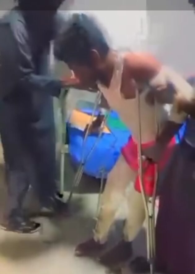 وكشف المقطع عن تدهور حالته الصحية لدرجة عدم قدرته على المشي إلا بالاستعانة بـ “عكازات”، مما يشير إلى حجم الإصابة التي تعرض لها خلال العمليات العسكرية الجارية.