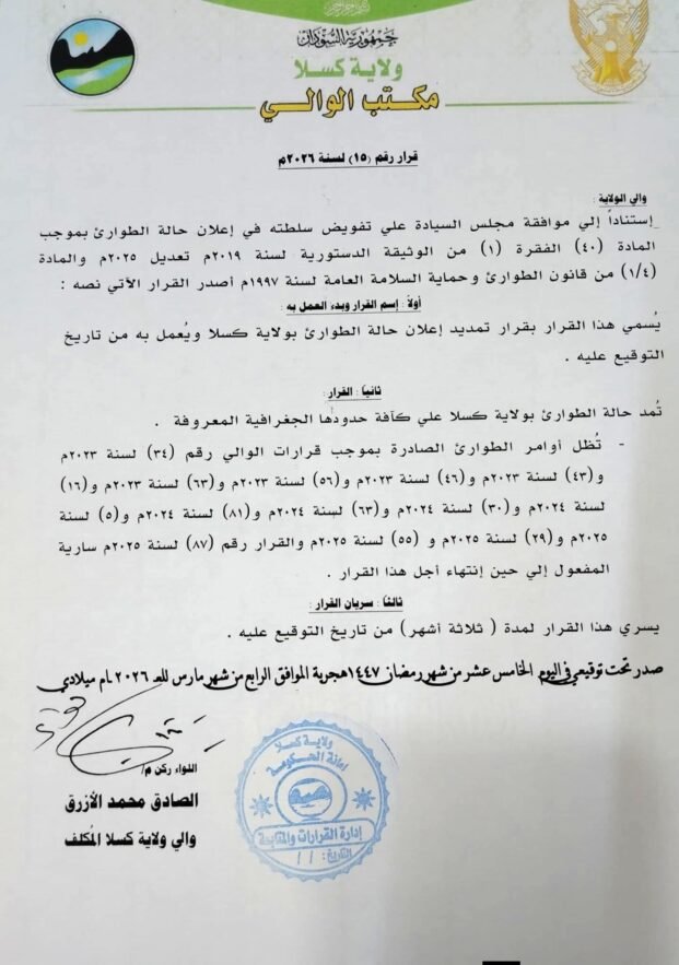 أصدر والي ولاية كسلا المكلف، اللواء ركن (م) الصادق محمد الأزرق، القرار رقم (15) لسنة 2026م، والذي يقضي بتمديد حالة الطوارئ في كافة حدود الولاية الجغرافية المعروفة.