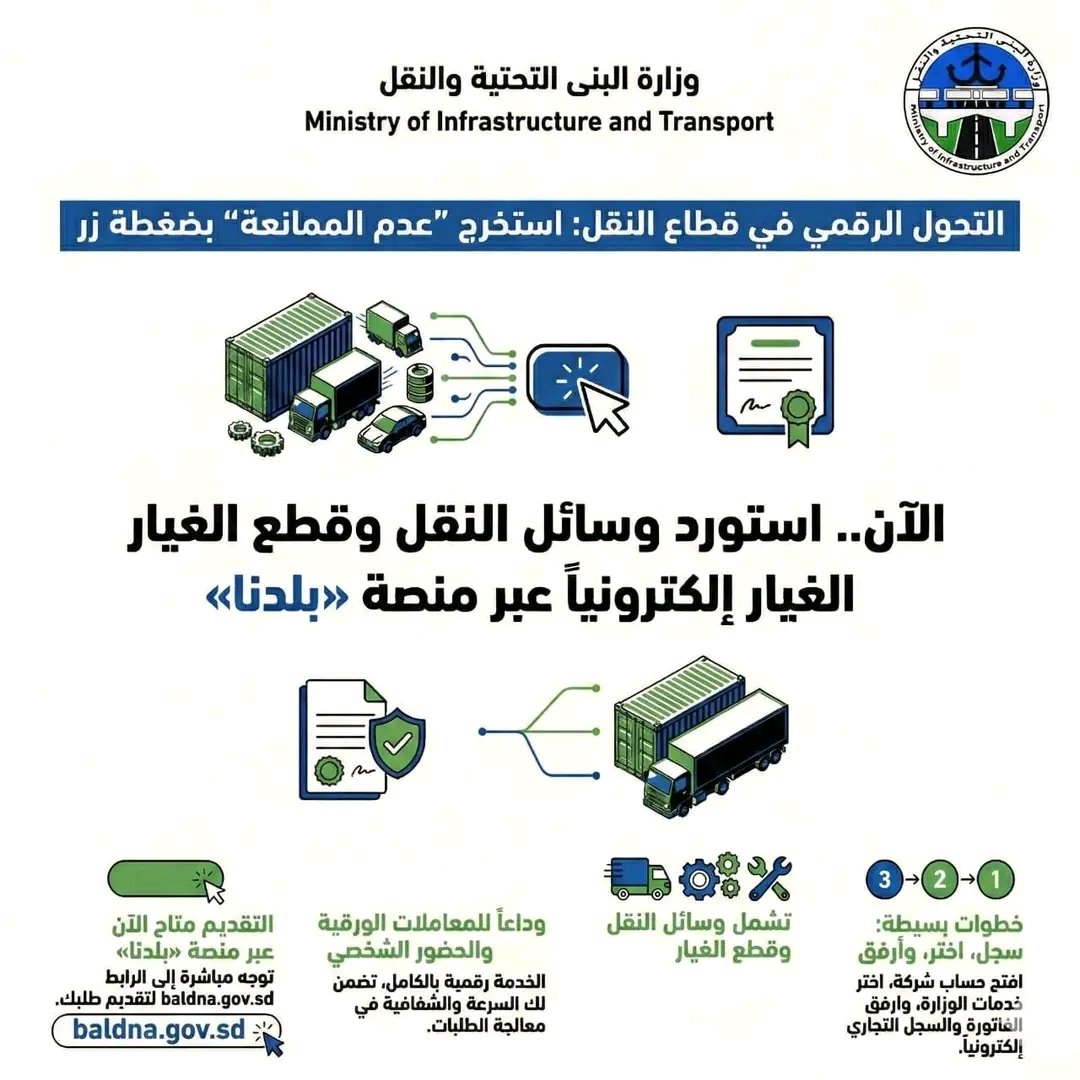 ودعت إدارة الإعلام والعلاقات العامة بالوزارة جميع الشركات والمتعاملين إلى الالتزام بالتقديم حصرياً عبر الرابط الرسمي للمنصة (baldna.gov.sd)، مؤكدة أن الاعتماد على الحلول الرقمية يعد ركيزة أساسية لتعزيز الحوكمة وتسريع وتيرة الاستيراد بما يخدم قطاع النقل والبنى التحتية في البلاد.